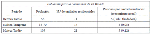 Al usar el número estándar de 5 habitantes por vivienda (Boada, 2007: 83), observamos que en El Venado hubo un crecimiento anual de 0,05 personas desde el período Herrera Tardío al Muisca Temprano, y un aumento anual de 0,12 personas desde el Muisca Temprano al Muisca Tardío (Tabla 4). Eso implicó que del período Herrera Tardío al Muisca Temprano, una nueva persona fuera añadida a la comunidad cada 20 años, y que una nueva residencia se fundara cada 100 años. Del período Muisca Temprano al Muisca Tardío la inclusión de una nueva persona habría tomado 8,6 años y la formación de una nueva unidad residencial de 5 personas habría ocurrido cada casi 43 años. Si usamos el incremento porcentual vemos que se habría dado un aumento anual de 0,14 personas desde el Herrera Tardío al Muisca Temprano; es decir, una nueva persona habría ingresado a la comunidad cada 6,8 años durante ese lapso. En tanto que un aumento anual entre 0,86 y 0,93 del Muisca Temprano al Muisca Tardío habría facilitado la inclusión de un nuevo miembro a la comunidad cada año o 13 meses (Tabla 5).