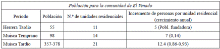 Con base en el número de 6 personas por familia, se ha propuesto una población inicial de 36 personas para el período Formativo 1 (González, 2007: 61). Esta población creció y para épocas del Formativo 2 habría formado la primera comunidad reconocible de 186 personas. Durante el Formativo 3, las 38 unidades residenciales habrían formado una comunidad de 228 personas, las cuales dieron origen a una comunidad mayor de 450 personas en el Clásico Regional; estas a su vez se habrían incrementado a 588 personas durante el período Reciente. Esto significó un aumento anual de 0,5 personas desde el Formativo 1 al Formativo 2, de 0,14 personas del Formativo 2 al Formativo 3, y de 0,25 personas del Formativo 3 al Clásico Regional (Tablas 2 y 3), y de 0,22 del Clásico al Reciente.