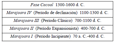 Los cacicazgos marajoara florecieron desde el 70 a. C. al 1300 d. C. en las planicies aluviales del bajo Amazonas (noreste de Brasil, ver nuevamente Figura 2), en la isla que recibe el mismo nombre. Ese tiempo está dividido en una secuencia de cinco períodos (Schaan, 2004): 1) Marajoara I o período Incipiente (70 a. C.-400 d. C.), 2) Marajoara II o período Expansionista (400-700 d. C.), 3) Marajoara III o período Clásico (700-1100 d. C.), 4) Marajoara IV o período de Declinación (1100-1300 d. C.), y 5) fase de Cacoal (1300-1600 d. C.) (Tabla 6).