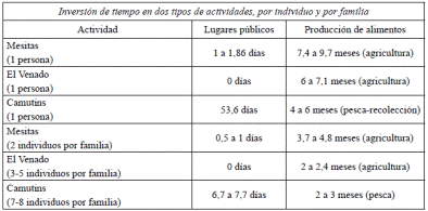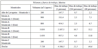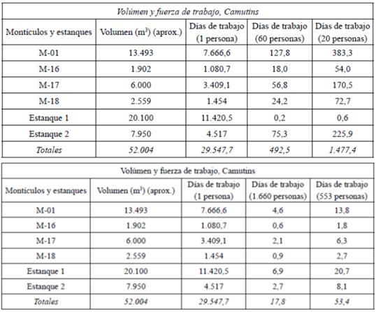 Al utilizar los cálculos de Erasmus (1965: 285), en los que un hombre puede mover 1,76 m2 de tierra durante cinco horas de trabajo constante usando una vara cavadora de madera y transportando el material a cuestas en una distancia de 100 m, se observa que la elaboración de los montículos de las Mesitas A, B, C y el Alto de Lavapatas, si hubiera sido simultánea, le habría consumido un tiempo de 4.386,3 días a una sola persona tomada aisladamente de su contexto social y demográfico (Tabla 7). Siguiendo estos parámetros, los montículos y los estanques de Camutins habrían requerido una inversión de trabajo de 2.9547,7 días a una sola persona (Tabla 8).