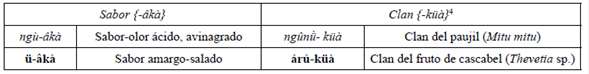 El mito de origen de los clanes contiene así una metonimia (sabor-olor, alimento preferido) que funda la sociedad tikuna. Seleccionamos de trabajos previos, como Montes (2001b: 121-123), Ahué et al. (2002: 20-21) y Goulard (2013: 79 y 81), algunas de las asociaciones entre sabor y animal-emblema del clan. Los términos para “sabor” y “clan” son radicales nominales inalienables (tabla 1):
