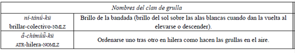 La mitad clánica de alados (o de aire) se designa con el término ã́-chií, literalmente “con plumas”, conformado del atributivo y el nombre dependiente “pluma”. Damos a continuación ejemplos de nombres clánicos de esta mitad, del clan de grulla (tabla 2):