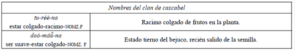 Los nombres clánicos masculinos se forman a partir de verbos (algunos de contenido atributivo) seguidos de un nombre ligado (parte del cuerpo) y del nominalizador {-kü}; refieren a rasgos del animal. Los nombres femeninos adicionan el nominalizador {-na}, que hace referencia a las características del vegetal asociado.