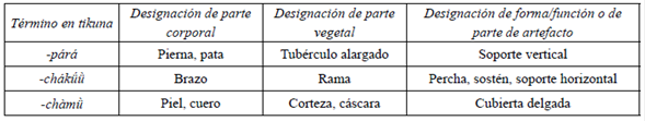 Para el lingüista, el cuerpo (vegetal, animal, humano, de artefactos) es además la fuente de un importante recurso gramatical: la clasificación nominal. Algunos términos corporales adquieren -además de la capacidad de designar una parte- el carácter de marcadores obligatorios, necesarios para la concordancia y para la retoma anafórica en el discurso. Este proceso de gramaticalización desde el léxico es visible en tikuna, donde coexiste la referencia a la parte corporal y la función clasificatoria mucho más abstracta. Ilustramos nuestra afirmación con algunos elementos léxicos que remiten a la “partología” y que se aplican tanto a elementos del cuerpo humano/animal y vegetal como a artefactos, un procedimiento que es común a buena parte de los términos partológicos (tabla 4):