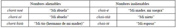 Los nombres alienables pueden expresar posesión, pero esta debe hacerse con un pronombre largo, chorü, en los ejemplos anteriores, no con la forma corta prefijada de los inalienables. Esta codificación formal diferenciada es la prueba de su diferencia semántica y cultural. La inalienabillidad corresponde, pues, a un comportamiento morfosintáctico muy claro, la dependencia de los radicales nominales que requieren ser puestos en relación con algo. Es interesante constatar que este rasgo gramatical es congruente con determinaciones culturales.
