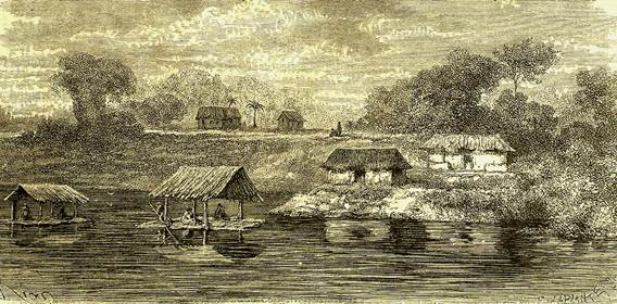 De aldea pasaría a “lugar”, en 1758, bajo el nuevo nombre de Alvelos. En 1833 retomó la denominación original y fue reconocida como “freguesía”.4 Posteriormente, en 1854, su sede se trasladó a un lugar cercano a la desembocadura del lago homónimo, donde hasta hoy se encuentra la sede del municipio. Alrededor de 1860, el diseñador-viajero Paul Marcoy llegó a Coari y produjo un registro que representaba características del lugar (Figura 1).