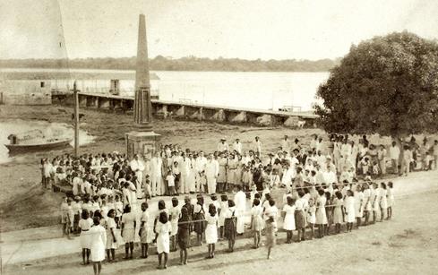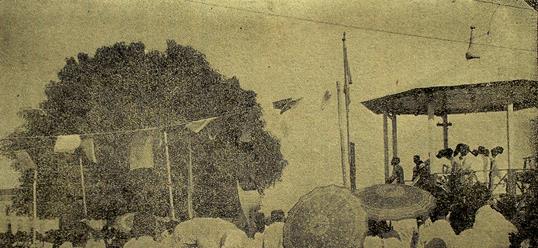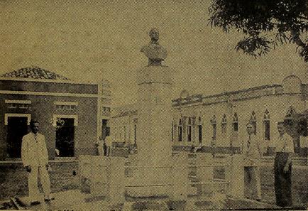 En fin, un último conjunto de fotografías, que juzgamos lo más importante, puede considerarse un repertorio visual que potencia la inversión simbólica en la ciudad. Se trata del núcleo, del obelisco, de un marco geográfico y de monumentos laudatorios (Figuras 18 a 26). Estas fotografías operan en la construcción de un recorrido funcional e histórico en el área más urbanizada de la ciudad, marcado por el civismo y por la creencia en el progreso económico-social y en la autonomía, desde que esta estuviera subordinada a un guía. Una serie de iconos se concentra en las proximidades del puerto, en la entonces bautizada plaza Getúlio Vargas, con el río y el trapiche detrás (el propio trapiche constituye uno de esos marcos) (figura 20). El local se caracteriza como de aglomeración pública, hacia donde deben acudir incluso los moradores más distantes, ahora conectados al centro por los puentes construidos por Montoril, que unen los arrabaldes a la ciudad y que antes estaban separados por igarapés.