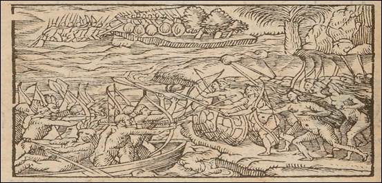 Más adelante, fue en el relato de Gaspar de Carvajal donde Orellana se enteró por primera vez de que se encontraban rodeados de súbditos de las amazonas:33 “Han de saber que ellos son sujetos y tributarios á las amazonas […]. Estas mujeres son muy altas y blancas y tienen el cabello muy largo y entrenzado y revuelto a la cabeza: son muy membrudas, andaban desnudas en cueros y atapadas sus vergüenzas, con sus arcos y flechas en las manos, haciendo tanta guerra como los indios […]” (Carvajal, 1894: 59-60).