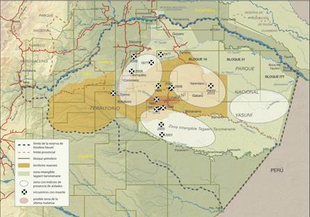 La situación de los PIAV es compleja porque se encuentran presionados o cercados por varios frentes. El primero se refiere a la expansión de la frontera agrícola y al uso compartido y conflictivo del mismo territorio de caza y recolección por clanes waorani; el segundo corresponde a las actividades de extracción petroleras que se han ampliado en la zona de influencia de los PIAV y que han facilitado la construcción de vías que a la vez permiten asentamientos permanentes de grupos colonos-campesinos (Los Reyes, Armadillo, Hormigueros), familias waorani contactadas (miwaguno y yawenpae) y familias shuar-colonas (tiwano), que presionan cada vez más los territorios por donde se movilizan los PIAV (en especial los localizados entre el área Tivacuno-Armadillo-Cononaco Chico-Menkaro):