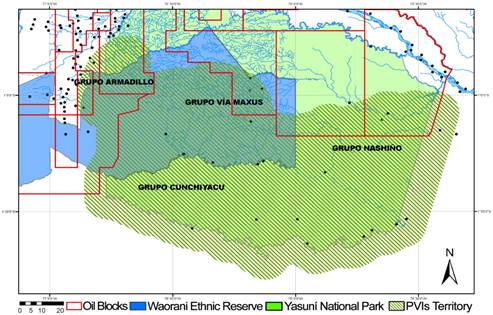 A partir de 1970, el petróleo se convirtió en el eje articulador de toda la conflictividad social vinculada con una migración (colonización) no planificada sobre todo en la Amazonía norte del Ecuador. La colonización se caracterizó por la formación de poblados distribuidos a lo largo de carreteras construidas por las empresas petroleras, que en la actualidad se encuentran en un dinámico proceso de urbanización y se han convertido en centros de acopio comercial y en los ejes dinamizadores de la ampliación de la frontera agrícola y extractiva en la región. La ampliación de la frontera petrolera cercó al territorio tradicional tanto de los PIAV como de las familias waorani; sin duda, la explotación de campos petroleros, tanto en el territorio étnico waorani, en el Parque Nacional Yasuní, como en el territorio de movilidad de las familias PIAV, ha sido lo que mayor impacto ha tenido en su forma de vida y reproducción sociocultural.