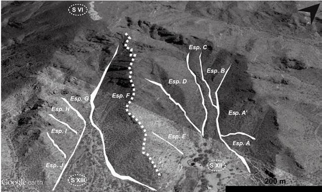 Los sectores xii y xiii están emplazados sobre la ladera norte de la quebrada El Carrizal y separados por la cresta de un espolón que delimita dos vaguadas (Cantarelli, 2017). Sobre la vaguada oriental, se localiza el sector xii y contiguamente el xiii. En la Figura 10 observamos la división de la ladera en once espolones numerados alfabéticamente desde la A hasta la J en sentido este-oeste. Las construcciones abarcan casi 100 metros longitudinales. Las obras más bajas fueron localizadas en zonas aluviales, mientras que las más elevadas se edificaron más próximas al sector vi. A diferencia de lo observado en el conjunto residencial de El Carmen, la disposición espacial de los sectores en El Carrizal no posibilita el contacto visual entre sus habitantes. Pero la distribución de las estructuras sobre una misma ladera habría facilitado una comunicación más estrecha. Es posible que la limitación visual proporcionara una circulación más libre.