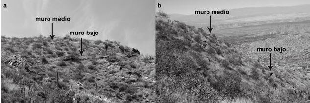 Para la caracterización cualitativa de los accesos norte y sur, identificamos barreras naturales y artificiales (Wynveldt y Balesta, 2009) que habrían facilitado el control y la defensa de los mismos. Entre las barreras naturales, registramos profundas cárcavas y riscos prominentes que circundan ambos accesos. Respecto a las artificiales, detectamos distintos tipos de muros. En el caso del sendero norte, destacamos las características de los sectores ii y ix. El primero está conformado por dos extensas murallas escalonadas que cortan transversalmente a la quebrada, y el segundo está constituido por un torreón (Coll et al., 2015). Entre las barreras artificiales más notorias del sendero sur, identificamos las terrazas defensivas3 localizadas en zonas elevadas del sector xii (Cantarelli, 2017) que resultan de la combinación de la estructura típica de las mismas con elementos arquitectónicos tales como, lajas clavadas de punta o parapetos. Esta categoría se define como una estructura aterrazada sobre la cual se dispone una hilera de lajas (Salvatierra, 1959; Pelissero y Difrieri, 1981; Tarragó, 1987; Nastri, 2001a).