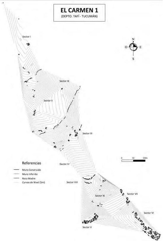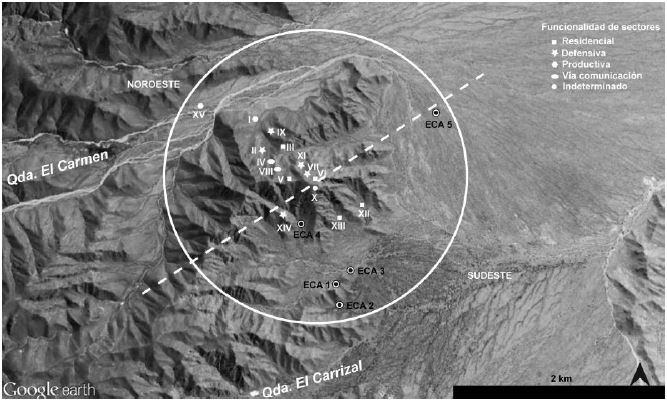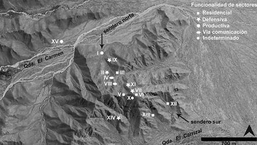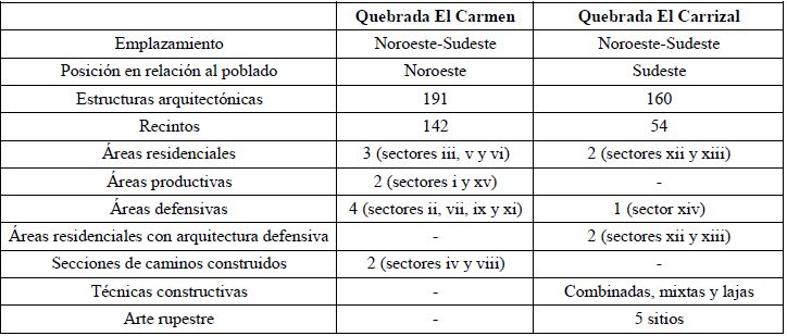 En primer lugar, en términos de distancia, el acceso por el sendero norte implica longitud de 1.000 metros aproximados en línea recta. En tanto que en el sendero sur se reduce a unos 500 metros aproximados. En segundo lugar, en el trayecto del sendero norte se visualizaron 62 estructuras (correspondientes a los sectores i, ii, iii, iv, vii, viii, ix y xi) numeradas desde el sector i hasta la cima del sector vi. En tanto que en el acceso sur se cuentan las 92 estructuras del sector xii. En tercer y último lugar, mencionamos que la localización apropiada de las construcciones arquitectónicas que presentan características defensivas (ii, vii, ix y xi), desde los cuales se visualizan apropiadamente el acceso a la quebrada, gran parte del valle de Santa María, y el tránsito y/o movimiento hacia el interior del poblado. Este mismo patrón es fácilmente observable en la quebrada El Carrizal, donde las terrazas defensivas se registran a una altura considerable, desde las cuales se accede a un amplio campo visual que abarca gran parte de la quebrada homónima y al valle de Santa María, posibilitando de esta forma el control de la circulación de los distintos agentes.