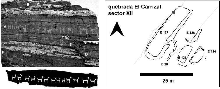 Asimismo, en la quebrada El Carrizal se re-localizaron (Vargas, Arislur, Gentile, Taboada y Nastri, 2016) sitios con arte rupestre que fueron trabajados por Adán Quiroga (1931) y publicados a póstuma. Pese a que las quebradas El Carmen y El Carrizal comparten un paisaje natural semejante que habría posibilitado las mismas condiciones para la existencia de paneles con arte rupestre, sólo se hallaron sitios con petroglifos en El Carrizal. Los cinco sitios identificados fueron denominados El Carrizal y se les asignó un número arábigo (Vargas et. al., 2016). En todos se reconocieron motivos de cuadrúpedos. A partir de ello, Vargas y colaboradores (2016) elaboraron una clasificación de los sitios y encontraron que en El Carrizal 2, 3 y 5 se repetían los mismos fenómenos. Los paneles que presentaban dos o más manifestaciones de cuadrúpedos cumplían con dos criterios: 1) los motivos se disponían sobre un mismo plano horizontal y 2) las cabezas se orientaban hacia el mismo lugar. A partir de esta evidencia los autores sugirieron la representación de escenas de llamas (Figura 13).