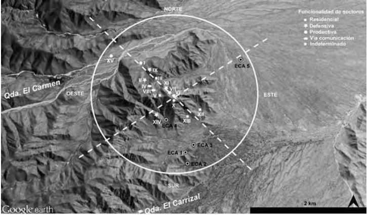 La división de quebradas y el trazado del sendero central, nos permiten apreciar la segmentación del asentamiento El Carmen 1 en cuatro. Cada una de las parcialidades estaría representada por un grupo social. En la Figura 14 observamos que los sectores residenciales se distribuyen sobre los cuatro puntos cardinales: sector vi en el norte, el sector xiii en el sur, el sector v en el oeste y el xii en el este. Los agentes sociales que representan las mitades habrían cooperado para mantener la estabilidad del sistema en sus múltiples dimensiones económicas, ideológicas y sociales, tanto al interior del asentamiento como en la relación con las poblaciones foráneas.