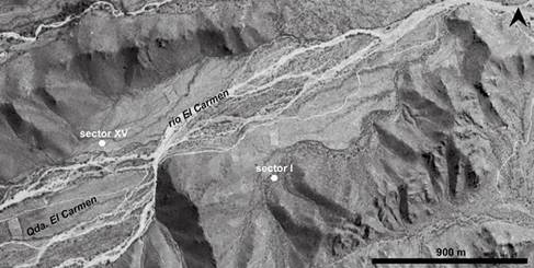 En los aluvios sur y norte de la quebrada El Carmen, se emplazan los sectores i y xv vinculados a actividades principalmente productivas. Se localizan en espacios desprotegidos natural y artificialmente (como se puede observar en la Figura 3), pero con un cómodo acceso a distintas fuentes de materia prima como arcillas, agua, combustibles, entre otras.