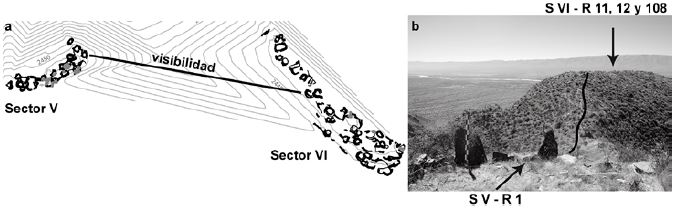 Los sectores v y vi de El Carmen se sitúan sobre cimas planas separadas por un collado (Figura 7). En el sector v, las estructuras se distribuyen de sudoeste a noreste mientras que en el sector vi, de sudeste a noroeste. El emplazamiento de los sectores por encima de los 2.440 m.s.n.m. habría favorecido la intervisibilidad de sus habitantes (Criado Boado, 1993; 1995; 1999). Desde los recintos orientales del sector v, es posible acceder visualmente a los recintos centrales del sector vi. En este sentido, podemos advertir que el contacto visual tendría implicancias funcionales -control de las actividades-, como también rituales o sagradas.