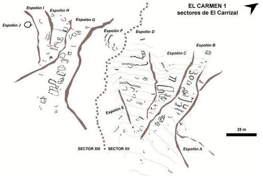 Entre 1994 y 1995, Nastri registró y reveló la existencia del sitio El Carmen 1 sobre la quebrada homónima. El autor mencionó su emplazamiento sobre cimas, laderas y al pie de dos espolones (Nastri, 1994). En 2011, se retomaron las actividades de campo que incluyeron excavaciones y relevamientos arquitectónicos de los sectores emplazados en la quebrada (Coll, Cantarelli y Nastri, 2015). En este trabajo partimos de la hipótesis de que la organización social del poblado El Carmen 1 se basaba en la complementariedad económica y social de las quebradas. Para corroborar dicha hipótesis se realizaron relevamientos arquitectónicos en la quebrada El Carrizal y se analizaron las muestras cerámicas recolectadas en superficie, lo que permitió un estudio espacial posterior.