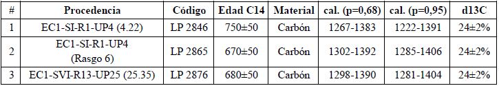 Se realizaron excavaciones en los sectores i y vi del asentamiento. Se procesaron tres muestras de carbón recuperadas en los recintos 1 (sector i) y 13 (sector vi). En la Tabla 110 presentamos los resultados que permitieron establecer la ocupación simultánea durante el Período Tardío (Coll et al., 2015).