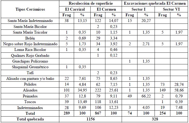 También se recuperaron en las dos quebradas fragmentos correspondientes a estilos tardíos como: Santa María Bicolor (El Carmen: 0,23%), Santa María Tricolor (El Carmen: 1,15%, El Carrizal: 0,35%), Belén (El Carmen: 3,34%, El Carrizal: 0,69%), Negro sobre Rojo Indeterminado (El Carmen: 3,92% y El Carrizal: 1,73%), Loma Rica Bicolor (El Carmen: 0,46%, El Carrizal: 0,35%) y Quilmes Rojo Grabado (El Carmen: 0,12%). En todos los casos, los porcentajes se mantienen bajos y semejantes en las muestras correspondientes de cada quebrada.