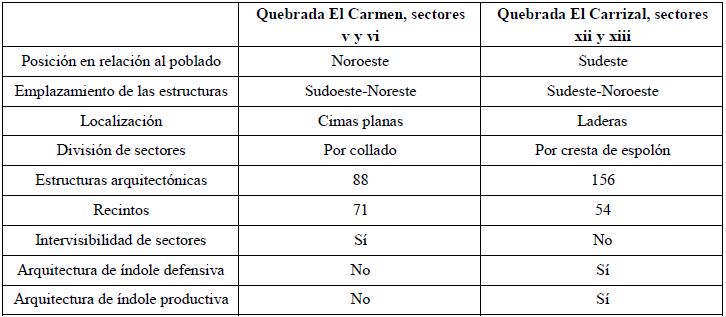 Los habitantes prehispánicos del poblado El Carmen 1 habitaron las quebradas El Carmen y El Carrizal, y en ambas quebradas construyeron zonas residenciales. En El Carmen, los sectores v y vi, conforman el área residencial y en El Carrizal, los sectores xii y xiii. En la Tabla 4 enseñamos la comparación de los conjuntos.