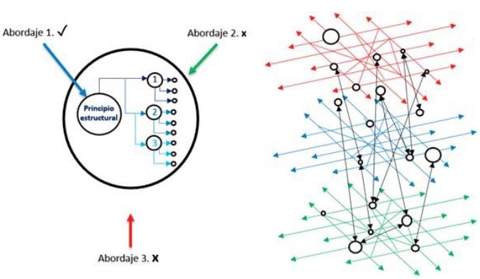 Pero la identidad nodal de las ceremonias de yagé sugiere que en estas prácticas rituales hay un “exceso” en los datos; es decir, un desbordamiento de relaciones que solamente es posible desglosar reconociendo su multiplicidad interna. Respondiendo a este tipo de problemáticas, Marilyn Strathern ([1991] 2004) sostiene que la antropología ha tomado un viraje de un énfasis plural a uno post-plural (Figura 1). Desde una lógica plural se seleccionarían entre los diversos abordajes posibles de un mismo fenómeno (porque este se encontraría autocontenido y, por lo tanto, sólo poseería una identidad), que pretenden alcanzar una mirada totalizante, la cual delimita, aísla y decanta los datos a partir de niveles jerárquicos. En contraste, desde un enfoque post-plural no existiría una totalidad unificada a razón de que un fenómeno social sería múltiple en sí mismo, cada elemento se articularía con otros, pero, a su vez, formaría parte de otras relaciones y, por lo tanto, escalas con su propia complejidad.9