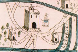 La representación de la iglesia y los glifos ocuparon un lugar destacado en el trazo de la pintura, pero también hay que notar que parece, por el tamaño de los bosquejos, que existe una contraparte, pues la grafía de ambos glifos se convierte en una unidad que no sólo ocupa la centralidad de la pintura, sino que está enmarcado por caminos rectos ya delineados a la manera de retícula, además casi rodeados por una serie de iglesias que casi cierran un círculo, como lo serían, de abajo hacia arriba, Santa María Magdalena, Transfiguración, San Juan Bautista, Santa Ana, luego una iglesia sin nombre, una cruz, y la Ermita en la Acequia.