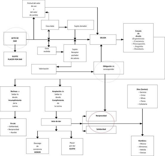 En su ensayo Sobre los dones y sobre la obligación, Marcel Mauss da respuesta a la siguiente interrogante: “¿Qué es lo que hace que, en sociedades, épocas y contextos tan diferentes, los individuos y/o los grupos se sientan obligados, no solamente a donar o, cuando se les dona, a recibir, sino también se sientan obligados, cuando han recibido, a devolver lo que se les ha donado, y a devolver, ya sea la misma cosa (o su equivalente), ya sea alguna cosa mayor o mejor?” (2007: 67). Según este autor, lo que hace que los individuos o grupos sientan la obligación de donar y recibir -además de donar cuando se les ofrenda un regalo-, se debe a que, en el acto de donar, se instaura una doble relación entre el que dona y el que recibe, puesto que se produce un vínculo de solidaridad cuando “el donante comparte lo que tiene, o lo que es, con aquel al que dona” (Godelier, 1998: 25). Sin embargo, también se propicia una relación de superioridad, dado que el que recibe “el don y lo acepta contrae una deuda con aquel que se lo ha donado” (Godelier, 1998: 25). Por medio de esta deuda o regalo, quien recibe “se convierte en su deudor y por ello se halla hasta cierto punto bajo su autoridad, al menos hasta que no haya «devuelto» lo que se le donó” (Godelier, 1998: 25).