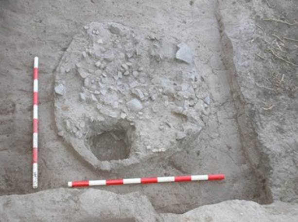 El Asán N.° 2 tenía 75 cm de diámetro (véase Figura 14). Su distancia con el Asán N.° 1 era de 1,4 m y con el Asán N.° 3 de 2,7 m. El espesor de la concentración de fragmentos estaba entre 15 y 25 cm (Ramírez, 2009: 100).