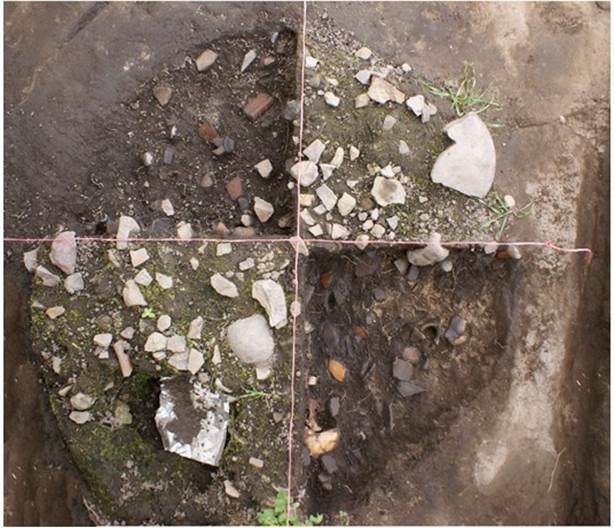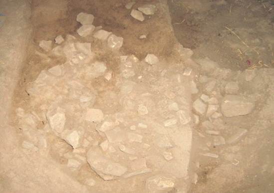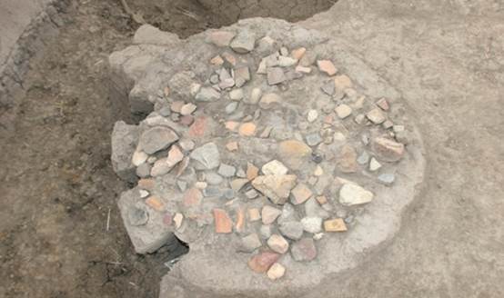 Durante la ampliación de perfiles, se identificaron tres estructuras funerarias consistentes en un amontonamiento circular de cerámica, huesos de animal, piedras y otros elementos culturales (véase Figura 12 ). Inicialmente fueron llamadas con el galicismo amas, pero este nombre fue reemplazado por el vocablo muisca asán, que significa “en su cima” o “en su parte de arriba”, y dicho dos veces significa “amontonamiento” (Becerra, 2010: 48-54).