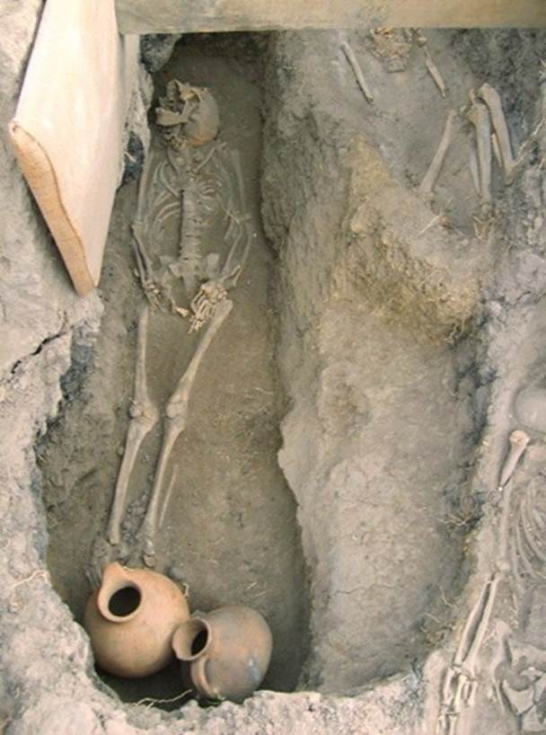 Tumba oval de pozo simple ancho, con un escalón interno de 20 cm. Contenía como ajuar, dos vasijas cerámicas depositadas a los pies del cuerpo, una en forma de tinaja y otra con una quilla pronunciada. Se encontró un individuo masculino de 40-45 años. El cuerpo fue dispuesto en decúbito dorsal, con brazos semiflexionados y piernas extendidas, los codos estaban levemente flexionados y las manos se dirigían hacia el bajo vientre. Las primeras seis vértebras cervicales se encontraban articuladas, levantadas hacia adelante en curvatura, indicando que el cuello estuvo flexionado y la mandíbula dirigida hacia el pecho. Las clavículas mostraban recogimiento a nivel de los hombros. Esto y la posición de las rodillas sugieren que el individuo estuvo amortajado (véase figura 18). Las muestras de violencia se manifiestan en la cabeza, la cual se encontraba orientada hacia el suroccidente y “descolgada” hacia atrás. El maxilar superior derecho tiene una línea de contusión, de 1,5 mm de grosor x 1 mm de profundidad x 30 mm de longitud, resultado de un golpe con un elemento filoso, posiblemente perimortem, debido a que no muestra signos de cicatrización (Ramírez, 2009: 114).