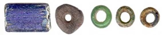 Este último elemento permite una datación calibrada según la cual el individuo habría muerto después de 1537, durante el Contacto. Se trata de cinco cuentas de collar de vidrio, de origen europeo. La primera es del tipo Nuevo Cádiz, de origen veneciano, y las otras cuatro son de origen español (véase Figura 20). Estas piezas fueron exóticas para los indígenas y se mencionan en las crónicas como objetos de intercambio (Fernández de Piedrahita, 1668/1881: 118). Silva Celis había descrito ya el hallazgo de cuentas de vidrio en tumbas muiscas, en las cuevas de La Belleza en Santander (Broadbent, 1965), sugiriendo con esto que los enterramientos databan del poscontacto.
