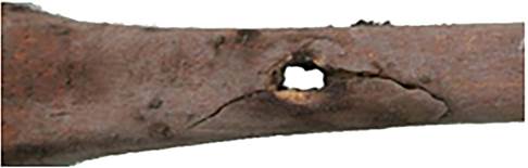 En el fémur izquierdo también presenta una perforación circular de 7 mm de diámetro que atraviesa la diáfisis en su tercio medio, los orificios de ambas paredes del fémur tienen la morfología típica de las perforaciones causadas por impacto de proyectil de arma de fuego. El orificio es completamente circular en la pared posterior del fémur y podría ser el resultado de la entrada del proyectil (Becerra y Groot, 2008: 70).