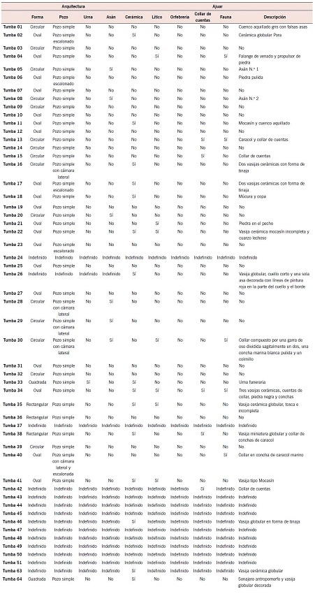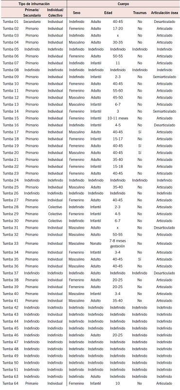 En las siguientes tablas se hace una descripción de esta excavación basada en estadísticas, a partir de las variantes tipo de enterramiento, arquitectura de las tumbas, forma de la tumba, ajuar, presencia de urnas funerarias, y otras definidas sobre el individuo, como sexo, edad, articulación, presencia de ajuar, tipo de ofrenda y también el reconocimiento de individuos con traumas en el tejido óseo (véanse Tablas 2 y 3 y Figuras 2 a 11).