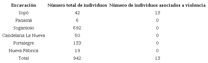 Los antecedentes aquí mencionados son algunas de las más importantes excavaciones arqueológicas realizadas en la zona muisca, las cuales permitieron adelantar una muestra estadística hasta 2008, año de inicio de la excavación en Usme. La sumatoria de estas excavaciones alcanza un universo de 942 individuos de los periodos Herrera, Muisca Temprano y Muisca Tardío. Los trece individuos encontrados en tumbas colectivas y sin ajuar que se interpretaron como restos de una batalla, son la única evidencia de hechos violentos relacionados con el área muisca. Aunque esta interpretación ha sido ampliamente debatida (Broadbent, 1965; Goez, 1936), se tienen en cuenta en esta muestra (véanse Tabla 1 y Figura 1). Los traumatismos descubiertos en Portalegre y Sogamoso están asociados a accidentes, no a agresiones (Rodríguez, 2006).