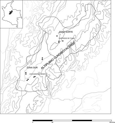 El altiplano Cundiboyacense es una extensa zona de aproximadamente 25.000 km² localizada en la cordillera Oriental, en el centro de Colombia. Es una altiplanicie fría, con una altura promedio de 2.700 msnm (véase Figura 1). Los primeros relatos hechos por los europeos en el siglo xvi informaron que allí habitaban comunidades muiscas organizadas en dos grandes cacicazgos, localizados en lo que actualmente es la ciudad de Tunja, al norte, y el municipio de Funza en cercanía a la actual ciudad de Bogotá, al sur (Anónimo, 1988 [c.a. 1537]). Desde entonces se ha entendido el altiplano Cundiboyacense como sinónimo de unidad cultural, haciéndolo coincidir con el territorio ocupado por los grupos muiscas (Botiva, 1989; Broadbent, 1964; Correa, 2004; Reichel-Dolmatoff, 1986; Restrepo, 1895). Solo recientemente se ha propuesto que dicha homogeneidad cultural tal vez esconde un alto grado de diversidad (Gamboa, 2010, 2015), pero aún no es claro el origen de ella o sus condicionantes.