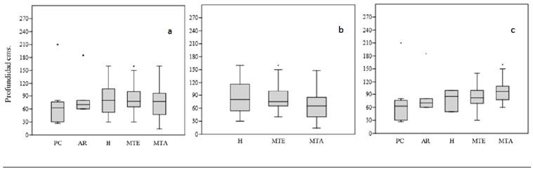Existen dos formas de medir la energía invertida en la construcción de una tumba: a través de la profundidad efectiva o por la sumatoria de la profundidad efectiva más otros elementos que impliquen tiempo y trabajo. La Figura 2 muestra el comportamiento de las tumbas de los diferentes periodos en el altiplano Cundiboyacense y el de cada zona por separado. La primera observación que se debe registrar es que a pesar de que el rango de tiempo cubre aproximadamente diez mil años, no se presentan cambios significativos en la profundidad promedio de las tumbas. En general, la mayor cantidad de tumbas, independientemente del periodo, tiene una profundidad entre 60 y 90 cm. Gracias a esta relativa homogeneidad, es posible advertir fácilmente cuando una tumba fue mucho más profunda que las demás, dentro de cada periodo. Contrario a lo esperado, los periodos donde existen tumbas con mayor profundidad son precisamente aquellos donde la información arqueológica indica que existieron sociedades igualitarias: Precerámico y Arcaico. Por el contrario, los periodos donde se supone existió algún grado de diferenciación social muestran un comportamiento más bien similar, sin alguna tumba que realmente exhiba una diferencia significativa en profundidad. Esta situación es ciertamente similar en las dos zonas.