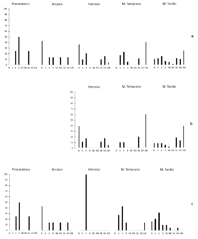 Respecto a las variables que darían cuenta de cambios en las creencias religiosas (sensuCarr, 1995), es posible documentar una tendencia hacia una mayor diversidad de orientaciones de los cuerpos a través del tiempo (véase Figura 5). Para el periodo Precerámico se documentaron solamente cuatro orientaciones, en tanto que para el Muisca Tardío hay nueve. A su vez, las zonas norte y sur muestran diferentes escenarios. Desde el periodo Herrera el norte muestra un importante grado de diversidad, mientras que el sur presenta mayor diversidad al inicio de la secuencia (Precerámico y Arcaico), seguida de una disminución de la diversidad en los periodos Herrera y Muisca Temprano, y la mayor diversidad en el periodo Tardío. También difiere el periodo en el cual la tendencia respecto a las mayores proporciones de cuerpos con una u otra orientación cambia en el norte y en el sur. En el norte el cambio entre la mayor proporción de cuerpos orientados al Norte y la mayor proporción de cuerpos sin orientación específica tuvo lugar durante el periodo Muisca Temprano; en tanto que en el sur la tendencia a enterrar los cuerpos con posición Este se origina durante el periodo Herrera. En suma, si se asume la orientación del cuerpo como un correlato de las creencias religiosas, es posible documentar una tendencia a una mayor diversidad desde el periodo Precerámico hasta el Muisca Tardío. En el sur del altiplano Cundiboyacense, donde se posee una secuencia más completa, un cambio significativo tuvo lugar durante el periodo Herrera, mientras que en el norte dicho cambio parece haber ocurrido durante el Muisca Temprano.