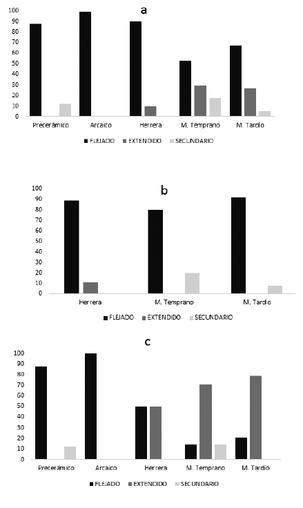 La Figura 6 muestra los porcentajes de tumbas según la posición del cuerpo y su variación a través del tiempo. Como ya se ha venido anotando, resalta la enorme diferencia entre las zonas sur y norte. Es claro el predominio de la práctica de enterrar a los individuos extendidos en las sociedades agroalfareras del sur, en tanto que en el norte los mayores porcentajes corresponden a la posición flejada. Precisamente esta última posición fue la predominante en el sur durante los periodos Precerámico y Arcaico, tendencia que cambió a partir del periodo Herrera en el cual aparece la práctica de enterrar a los individuos en posición extendida, haciéndose mucho más común hacia el final de la época prehispánica. Puesto en perspectiva, el mayor cambio en los patrones de disposición del cuerpo tuvo lugar en la transición entre los periodos Arcaico y Herrera en el sur. A partir del periodo Herrera, tanto en el norte como en el sur, los patrones de disposición del cuerpo se mantuvieron prácticamente iguales hasta el final de la época prehispánica.