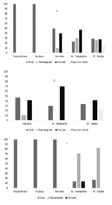 Es lógico que exista cierta correlación entre la posición del individuo y la forma de la tumba. Es así que los individuos flejados se encuentran generalmente en tumbas ovales o circulares y los extendidos en tumbas rectangulares. Al igual que lo observado respecto a la posición del cuerpo, no existe variación en la forma de la tumba durante los periodos Precerámico y Arcaico, en los cuales las tumbas son ovales sin excepción (véase Figura 7). Este tipo de tumba, y su variante circular, son las más comunes en las dos regiones durante el periodo Herrera. El cambio más importante tuvo lugar en el periodo Muisca Temprano en el sur, cuando aparecen las tumbas rectangulares, las cuales se hacen predominantes durante el Muisca Tardío. Si se comparan las prácticas de norte y sur se observa que el norte es muy homogéneo, presentando casi exclusivamente tumbas ovales o circulares (es posible que dicha diferenciación en realidad sea producto del registro hecho por los arqueólogos), a través de todos los periodos. Por el contrario, la aparición de tumbas rectangulares a partir del periodo Muisca Temprano marca un importante contraste con el patrón que se venía dando desde el periodo Precerámico, caracterizado por tumbas ovales.