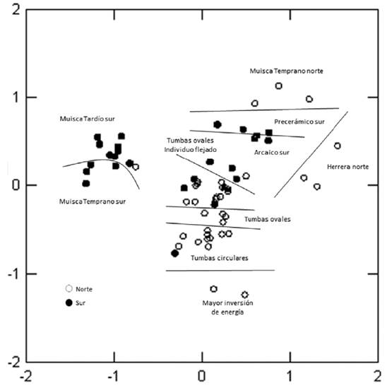 El análisis multidimensional de un conjunto de 65 tumbas confirma que la diferencia regional norte-sur es suficientemente significativa como para permitir distinguir claramente las tumbas de una y otra región (véase Figura 8). A renglón seguido, las diferencias temporales permiten subdividir dichos conjuntos con relativa facilidad. Aspectos como la variación en la forma de la tumba muestran cambios importantes en las formas de religiosidad de manera preponderante en la transición entre los periodos Herrera y Muisca Temprano en el norte y en la transición entre el Muisca Temprano y Muisca Tardío en el sur. Finalmente, las tumbas con mayor inversión de energía en los periodos Herrera y Muisca Tardío, ambas localizadas en el norte, resaltan entre las demás, lo que a su vez reafirma su importancia.