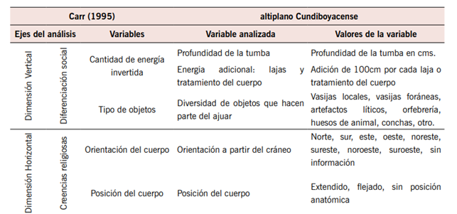 Los resultados del estudio de Carr indicaron que variables tales como la organización al interior de los cementerios, la cantidad de energía invertida y el tipo, no la cantidad, de objetos que componen el ajuar, son buenos indicadores de las diferencias sociales (variación vertical). De dichas variables, la diferencia en energía invertida es sin duda la que mejor da cuenta de las diferencias sociales, lo que confirma el planteamiento básico de Binford (1971) y Saxe (1970) (véase también Tainter, 1978), seguida por el tipo de objetos que componen el ajuar. Por el contrario, variables como la orientación y posición del cuerpo son determinadas por creencias y dictámenes religiosos (variación horizontal). De estas dos variables, la orientación del cuerpo parece ser la que mejor da cuenta de las creencias religiosas (véase Tabla 1).