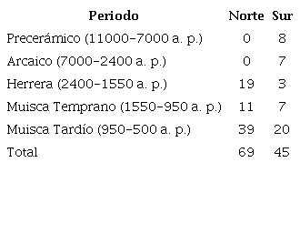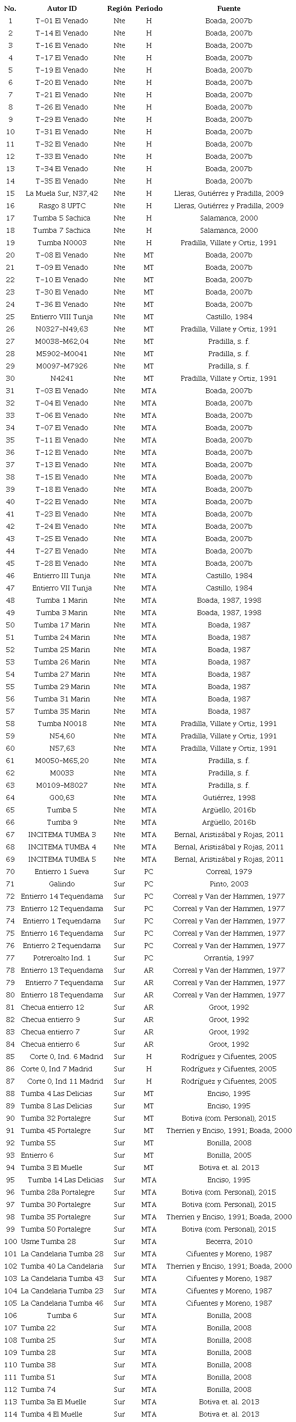 De lo anterior se colige que el número de tumbas del altiplano Cundiboyacense que pueden ser objeto de un análisis sistemático se reduce dramáticamente. En pocas palabras, para realizar un análisis comparativo-controlado es necesario sacrificar la cantidad de información por la calidad de datos que pueden ser efectivamente analizados. De acuerdo con esa premisa, se revisaron todos los informes arqueológicos en los que se reporta el hallazgo de tumbas de la época prehispánica. Para poder ser incluida en la base de datos, una tumba debía pasar por dos filtros básicos: la posibilidad de asignar una cronología confiable y la existencia de información detallada sobre ella (dimensiones de la tumba, ajuar, individuo). Finalmente, se pudo construir una base de datos de 114 tumbas pertenecientes a diferentes periodos arqueológicos y zonas del altiplano Cundiboyacense (véanse Tablas 2 y 3). Esto último se hizo con el fin de evaluar el grado de diversidad de las zonas norte y sur del altiplano Cundiboyacense.