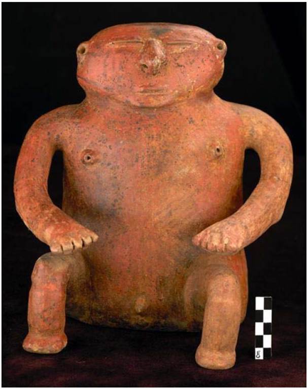 Por su parte, el trabajo de Uribe (2005), detalla la importante representación de formas de mujeres y de frutos, los cuales son asociados a diversos aspectos sociales y de simbolismo que tuvieron lugar durante el periodo Temprano y donde fueron característicos aspectos como: “el realismo y el énfasis en el volumen; la preponderancia de las formas femeninas y de frutos; la redondez, el hieratismo, la desnudez, los rostros triangulares con ojos semi-cerrados, la pintura facial de líneas que atraviesan longitudinalmente el rostro y muchos otros rasgos de la representación humana, así como el gusto por las superficies lisas y brillantes” (p. 65). La importancia de la figura femenina en estas piezas denota: “significados de fecundidad, vida, renacimiento y transformación, tanto para los objetos como para los frutos con los que se asocian” (Uribe, 2005: 79). Por su parte, Bruhns (2006) destaca que la representación frecuente de figuras femeninas sentadas sobre un banco como las figuras de caciques tanto en las urnas funerarias como en la orfebrería sugiere la importancia de las mujeres en la vida política y en los rituales (p. 11).