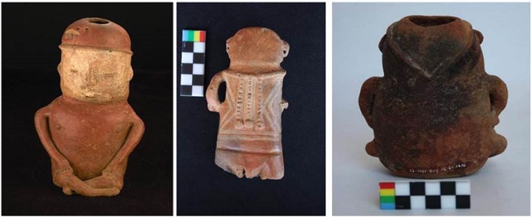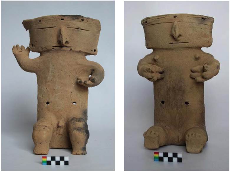 Todas las figurinas analizadas corresponden a representaciones con un único individuo, sin embargo, se tienen reportes de efigies dobles comunicadas por un canal (MUSA, 2006), y una pieza retablo que representa un personaje femenino con un infante en el brazo, el cual tiene las mismas características de la figura grande.6