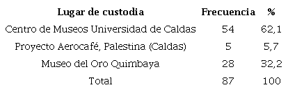 Se analizaron en total 87 figurinas antropomorfas, las cuales están distribuidas según la institución que las custodia (véase Tabla 1). Las piezas correspondientes al Proyecto Arqueológico Aerocafé se encontraban en el laboratorio del municipio de Palestina en estanterías con rótulos. En el Centro de Museos de la Universidad de Caldas cada una de las figurinas estaba localizada en el depósito, en estanterías con rótulos. Las piezas del Museo del Oro Quimbaya en Armenia, se encontraban en la sala de exhibición y su información y fotografías fueron suministradas directamente por el museo. La mayoría de las piezas estaban completas (65,5%), con evidencia de procesos de restauración, y han sido asociadas al periodo Tardío, con fechas que oscilan entre 700 y 1600 d. C.