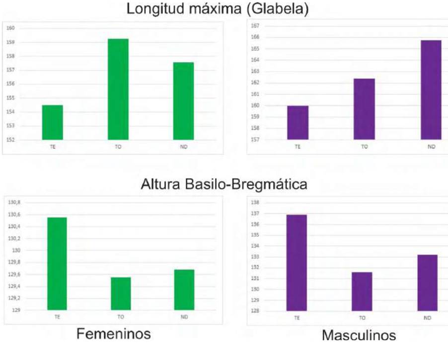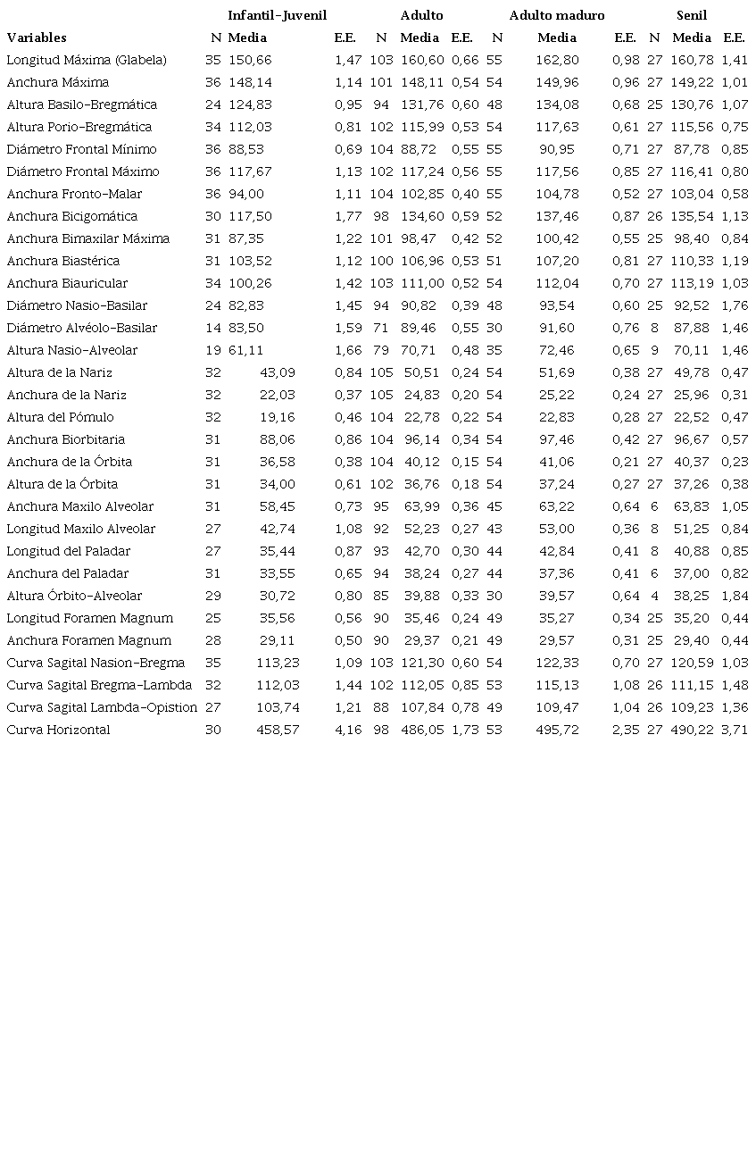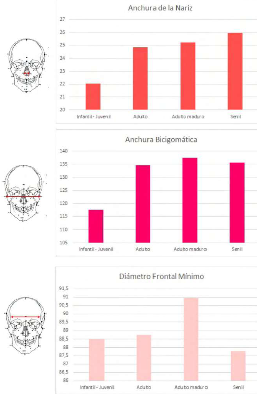 En el estudio realizado en la población prehispánica de la puna de Jujuy, se definieron tres tipos de comportamiento de los rasgos métricos del cráneo según los valores medios de las variables por cada clase de edad. Uno de los comportamientos observados establecía que las variables aumentan sus promedios hasta la edad adulta y luego disminuyen en la categoría senil, como por ejemplo, la longitud máxima y la anchura bimaxilar máxima (Fuchs, Cocilovo y Varela, 2015: 4). Esta misma tendencia se manifiesta en el análisis de la población de Pucará de Tilcara.