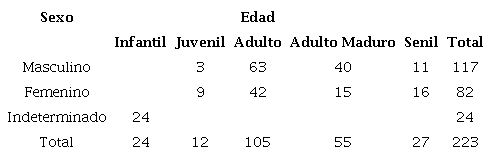 Los resultados indican mayor proporción de individuos masculinos (N=117; 52,5%) con respecto a los individuos femeninos (N=82; 36,8%). Los individuos a los que no se les pudo determinar el sexo representan el 10,8% (N=24). Además, la mayoría de los individuos son adultos (N=105; 47,1%); le siguen en menor proporción los adultos maduros (N=55; 24,7%), seniles (N=27; 12,1%), infantiles (N=24; 10,8%) y los individuos juveniles (N=12; 5,4%). Con respecto a la deformación artificial del cráneo, se practicó la deformación tabular oblicua (N=77; 34,5%) y la tabular erecta (N=52; 23,3%), y la mayoría de los individuos no presentaron deformación (N=94; 42,2%). Asimismo, se observa una mayor proporción de individuos masculinos deformados tabulares erectos y predominio de femeninos tabulares oblicuos.
