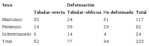 Con respecto a la práctica de deformación artificial del cráneo en Pucará de Tilcara, podemos decir que de los 223 individuos adultos, la mayoría no presenta deformación (42%) y el resto de los individuos presentan deformación tabular oblicua (35%) y tabular erecta (23%). La mayoría de los individuos con deformación tabular oblicua son de sexo femenino, mientras que los individuos de sexo masculino presentan deformación tabular erecta (véase Tabla 2).