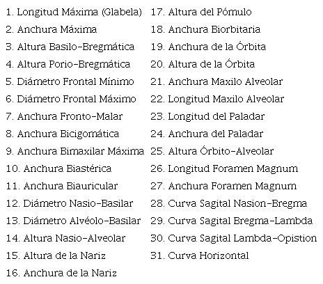 Buikstra, Jane y Ubelaker, Douglas (1994). Standards for data collection from human skeletal remains. Research Report Series N.° 44. Arkansas Archeological Survey, Fayetteville.